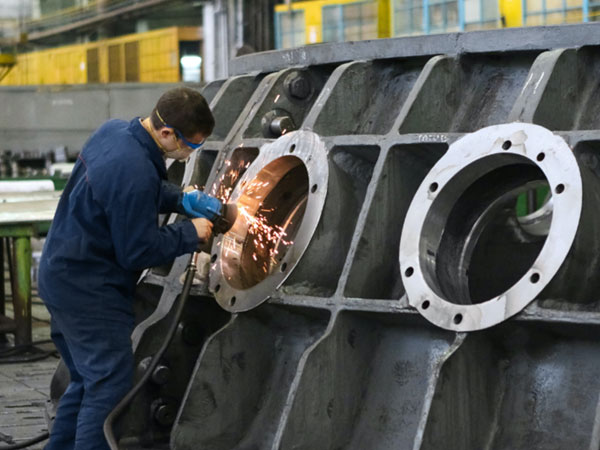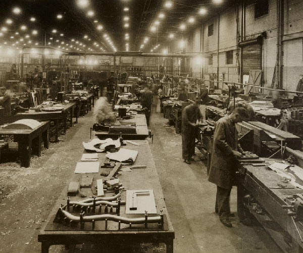 consisting of several buildings filled with machinery, where workers manufacture items or